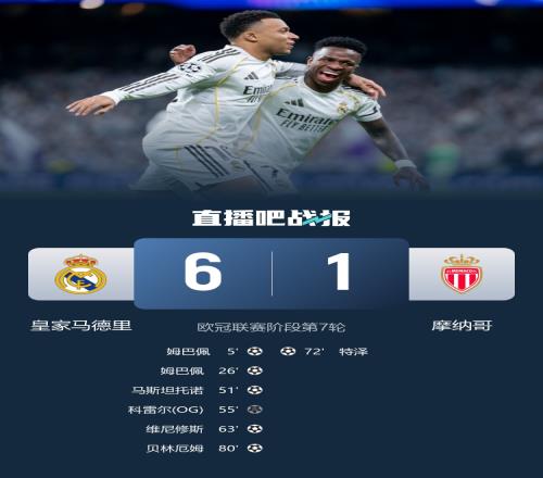 下半场补时3分钟,皇马6-1摩纳哥。