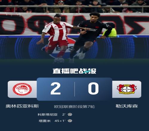 体育播报1月21日宣 北京时间1月21日凌晨4时整,2025-26赛季欧冠联赛阶段第7轮在卡雷斯卡基斯体育场展开角逐,勒沃库森客场对阵奥林匹亚科斯。上半场科斯蒂尼亚首开记录,塔雷米扩大比分,下半场希克失良机。最终勒沃库森客场0-2不敌奥林匹亚科斯,药厂遭遇各赛事3连败。欧冠积分榜方面,勒沃库森积9分位居第19,奥林匹亚科斯积8分名列第22。