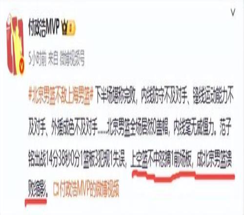 赛后媒体人付政浩对北京队的表现大失所望,指出“下半场堪称完败,内线防守不及对手、锋线运动能力不及对手、外援成色不及对手……北京男篮全场居然0盖帽,内线毫无威慑力”,他还喷了顶薪球员范子铭,他说“范子铭出战14分38秒0分1篮板3犯规1失误,上空篮不中怒摘1前场板,成北京男篮溃败缩影。”两外主打第四节的球员范子铭和方硕合砍0分,怪不得末节全队仅得12分,怪不得付政浩说下半场堪称完败,怪不得吐槽范子铭是北京队溃败的缩影。