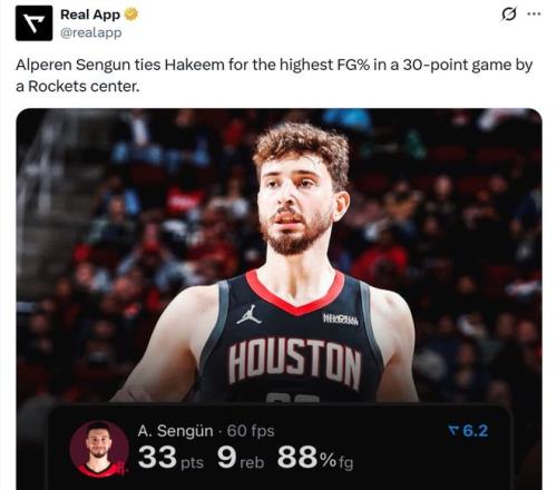 凭借这样的表现,申京成功追平大梦,成为火箭队史单场砍下30+得分表现最高效的中锋,命中率高达88%。