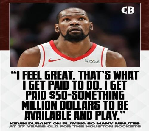 赛前杜兰特谈到自己37岁高龄还场均打36.9分钟,他表示:我感觉很棒,这就是我的工作意义所在,我拿着5000多万的薪水就是要在赛场拼搏,我每晚都准备打48分钟,如果能完成这个要求我就满足了。