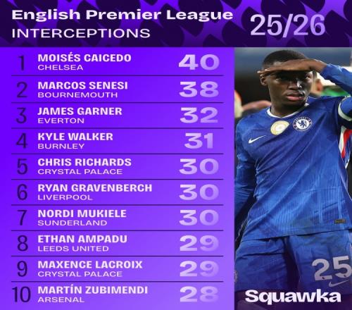 本赛季英超拦截次数排名:凯塞多40次居首,塞内西38次第二
