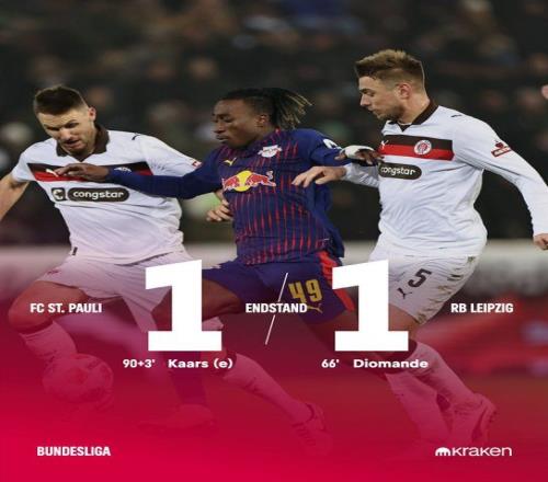 北京时间1月28日03:30,德甲联赛第16轮,圣保利在主场米勒门球场迎战RB莱比锡。上半场双方均无建树,半场0-0结束。易边再战,第66分钟,扬-迪奥曼德破门为RB莱比锡取得领先;补时阶段,劳姆送点,卡尔斯主罚点球命中,帮助圣保利扳平比分。最终双方1比1战平。