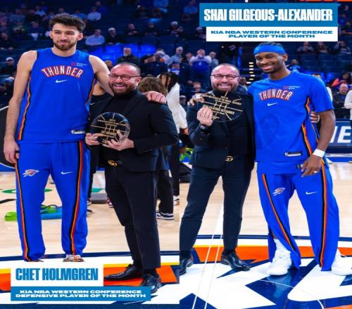 赛前,雷霆球星亚历山大领取了12月的月最佳奖杯,霍姆格伦则领取了12月月最佳防守球员奖杯。