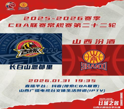 北京时间2026年1月31日19:35,2025-2026赛季CBA联赛常规赛第22轮继续进行,山西汾酒客场挑战长白山恩都里,球迷观众可以通过抖音(搜索CBA联赛)、山西广播电视台文体生活频道(IPTV)观看比赛实况,与我们一同为山西汾酒男篮加油助威!