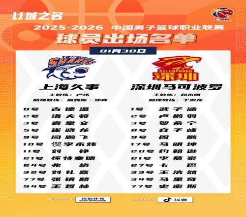 体育播报1月30日宣 今晚19:35,上海主场迎战深圳,赛前大名单出炉。